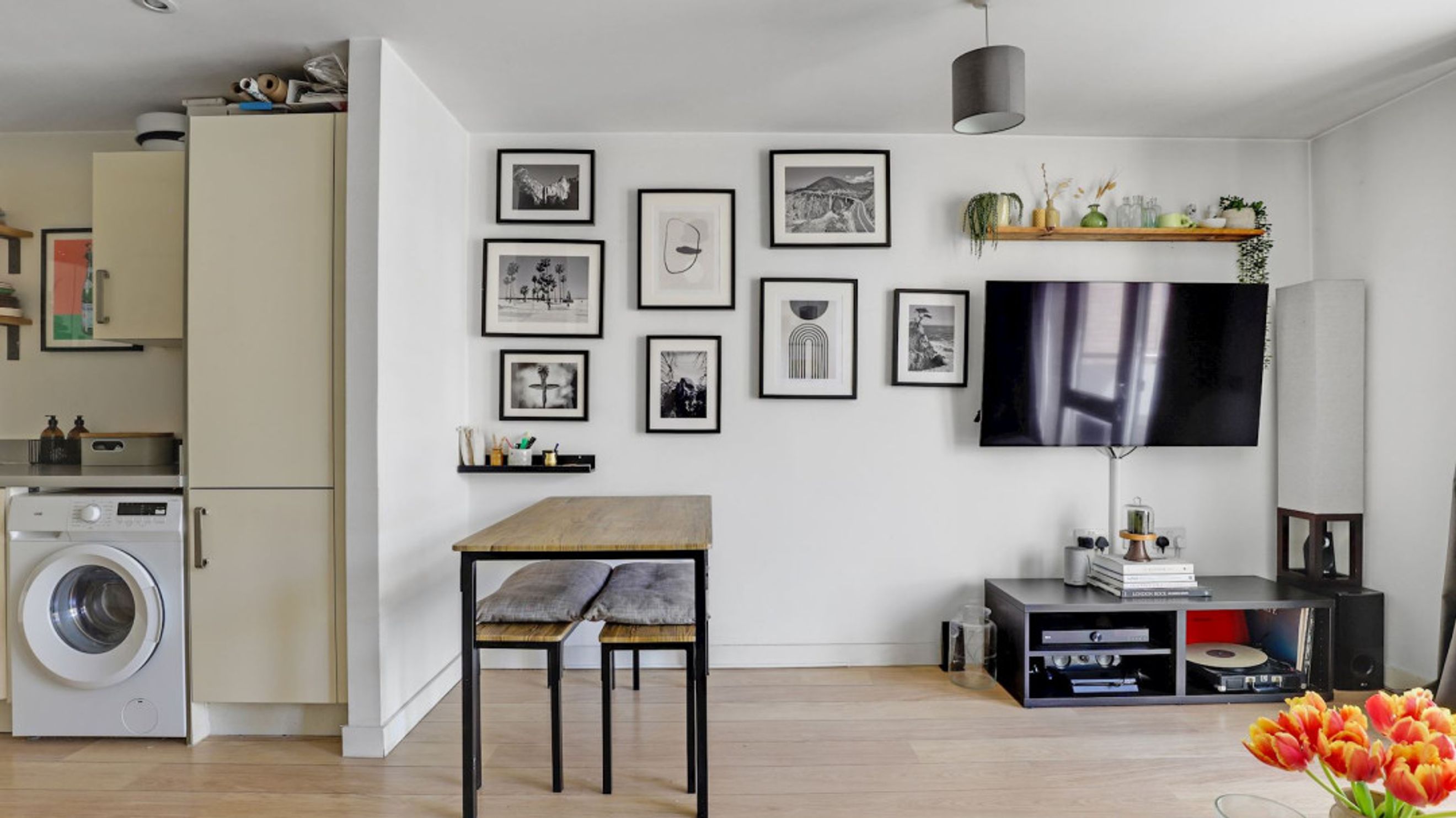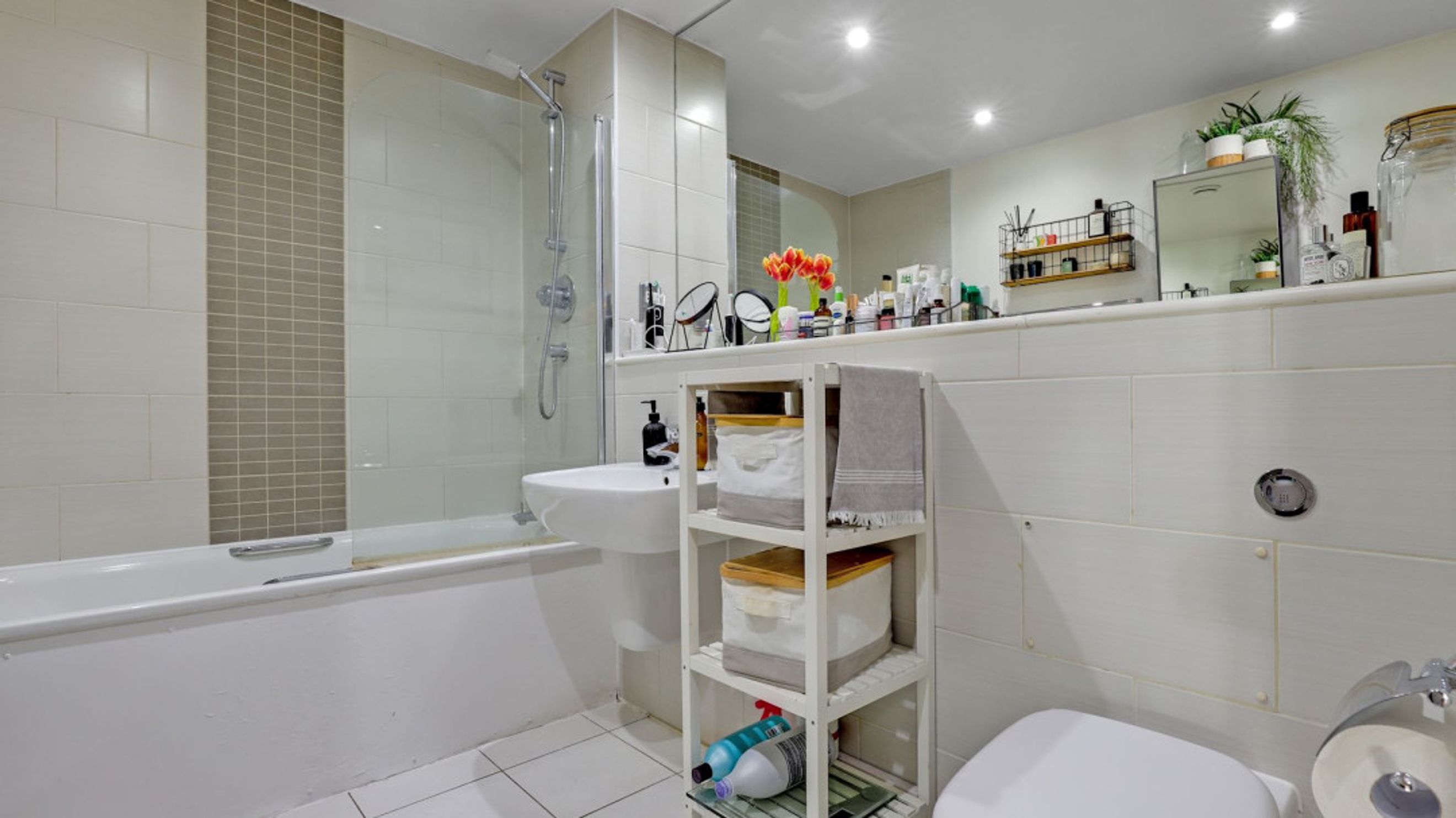 The kitchen is neatly tucked away behind a subtle partition, giving you a sense of separation without losing the open-plan feel. There's plenty of storage throughout, including built-in wardrobes in the cosy bedroom, and a modern, contemporary bathroom, featuring a full-sized bath with an overhead shower, modern tiling, a large wall mirror that enhances the space, and clever shelving for all your essentials, offering both style and practicality.