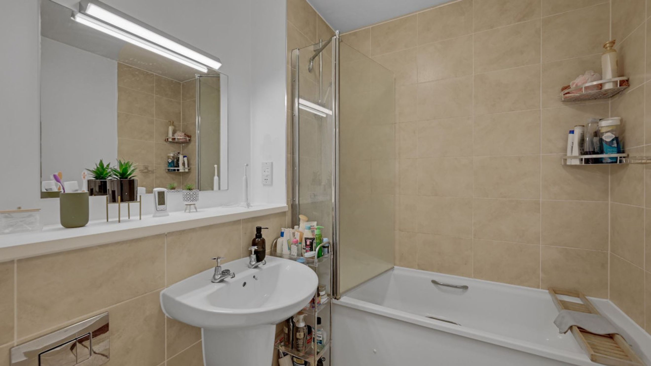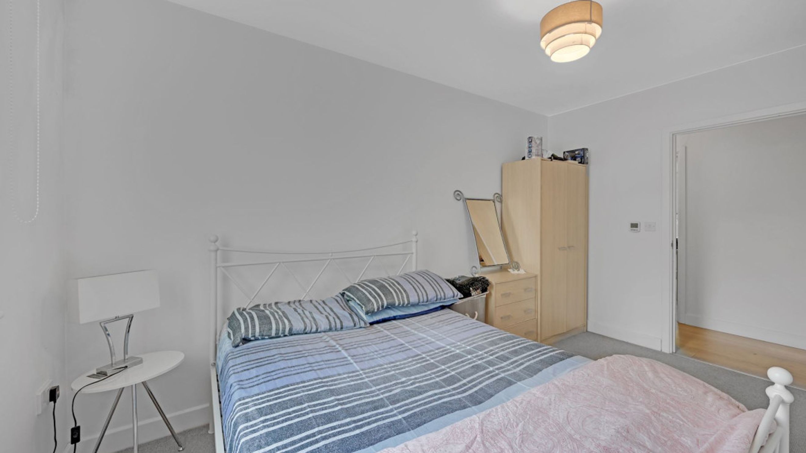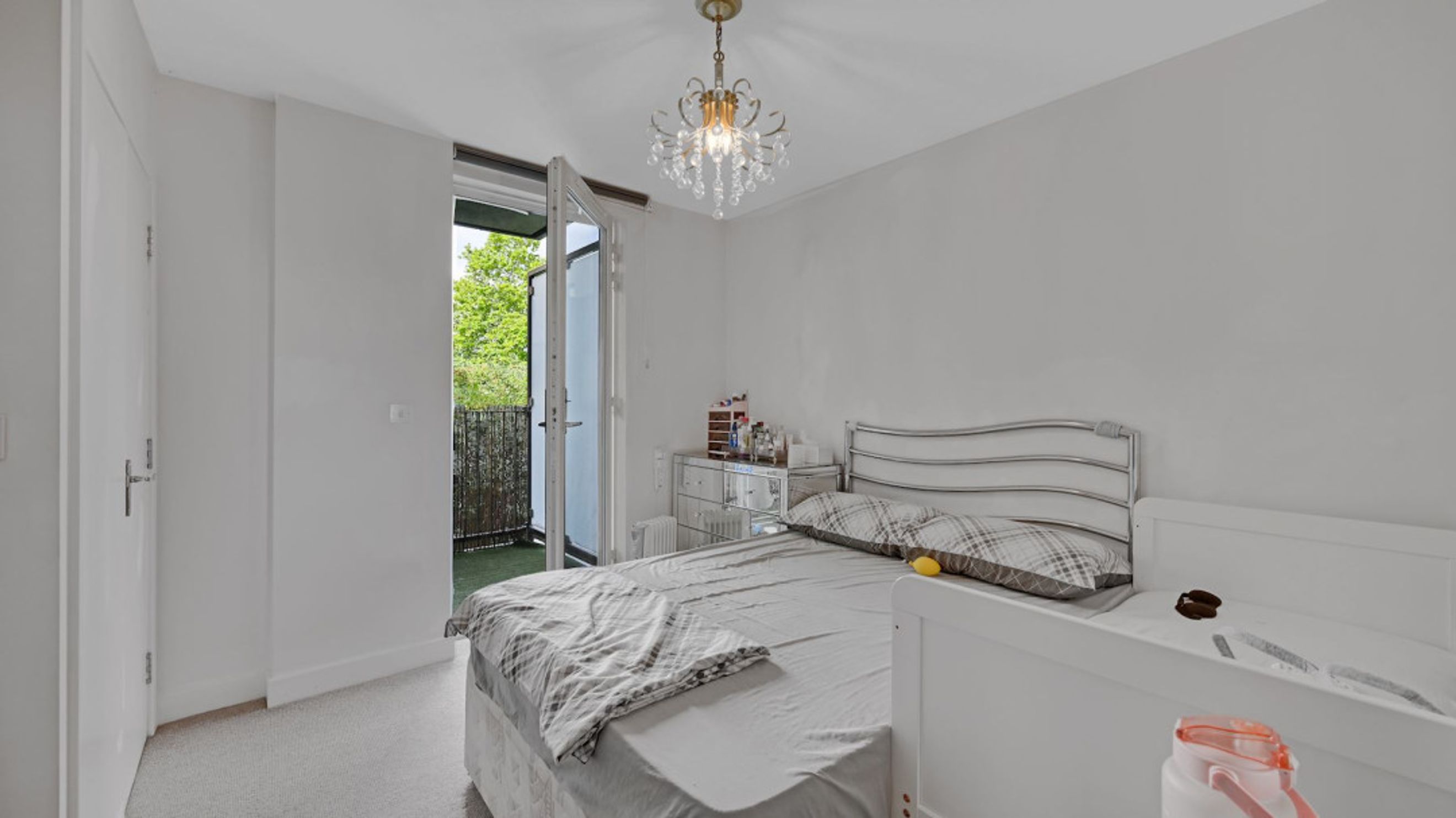 Both bedrooms are well-sized doubles, with the larger bedroom also benefitting from its own private balcony, creating a peaceful outdoor retreat. The modern bathroom features neutral tiling and a full-sized bath with overhead shower.