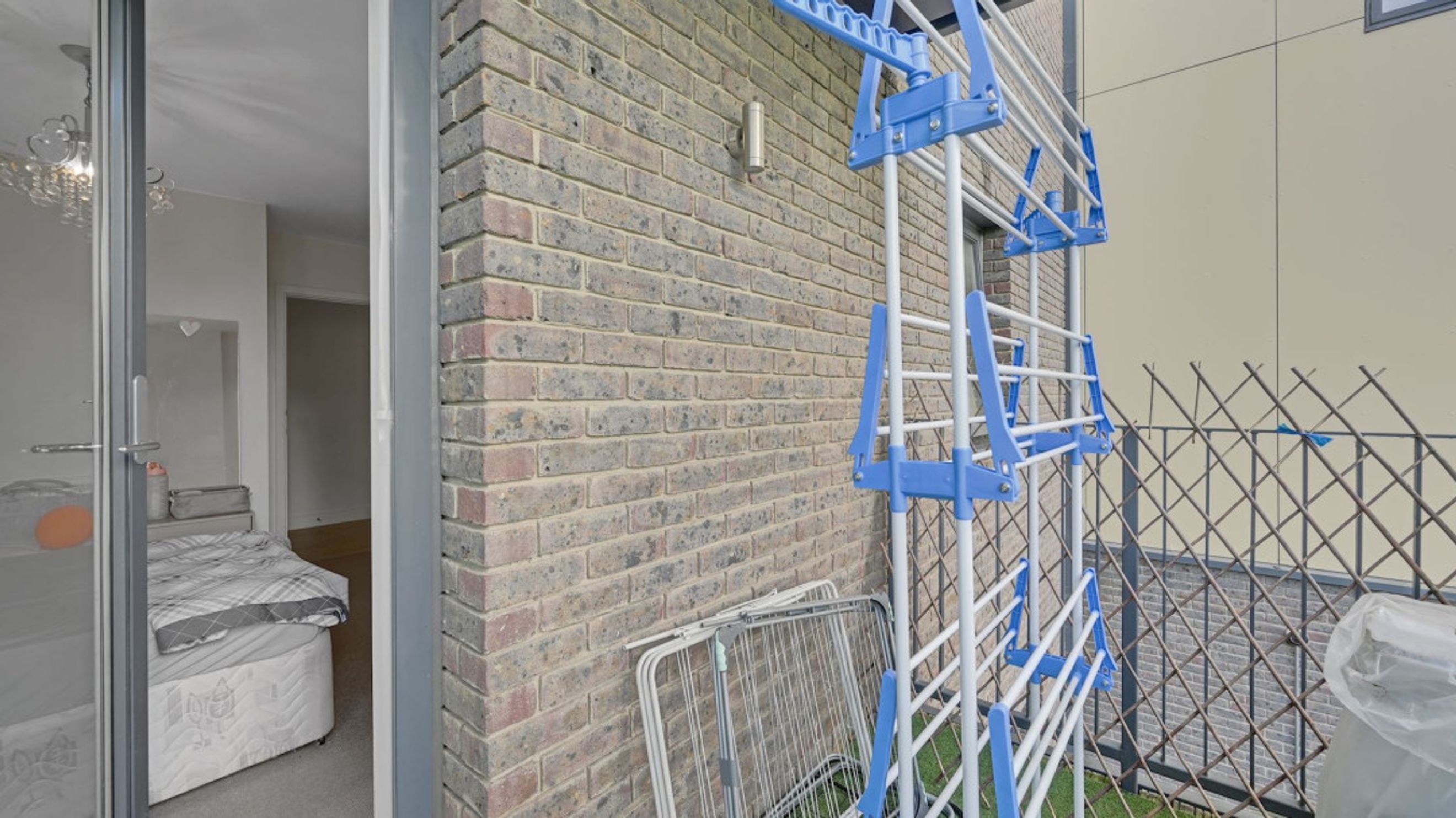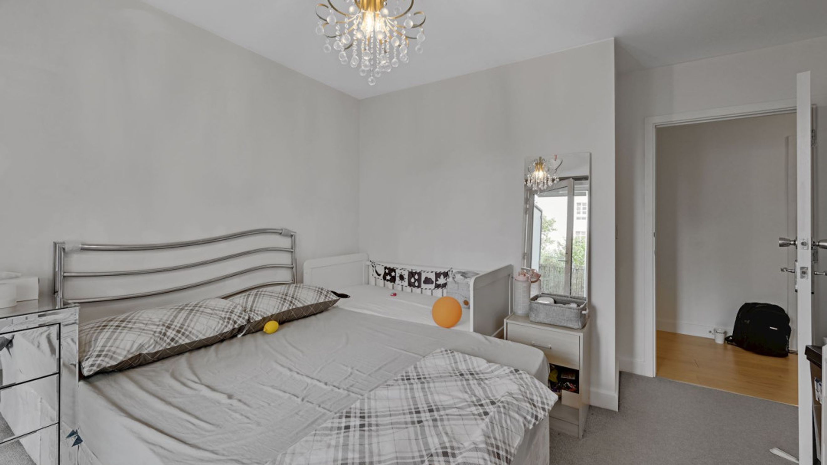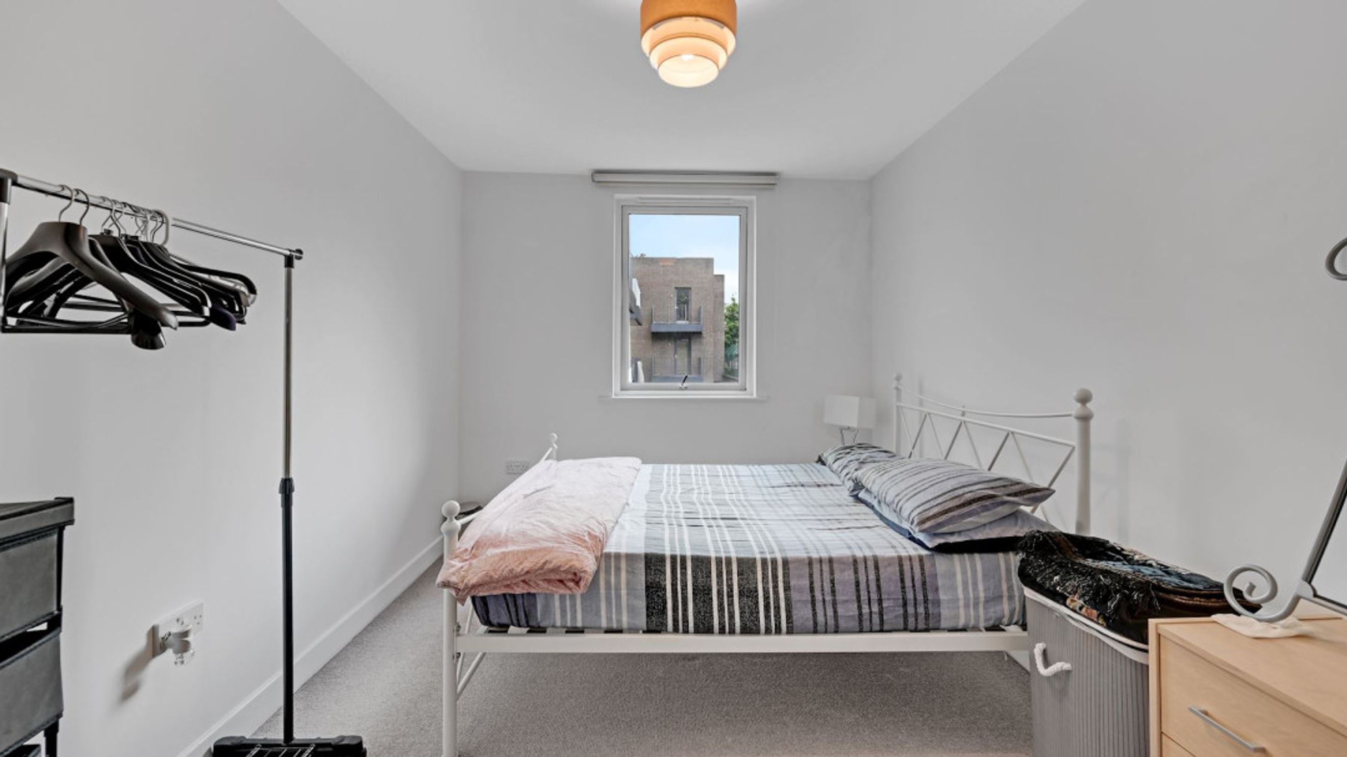 Both bedrooms are well-sized doubles, with the larger bedroom also benefitting from its own private balcony, creating a peaceful outdoor retreat. The modern bathroom features neutral tiling and a full-sized bath with overhead shower.