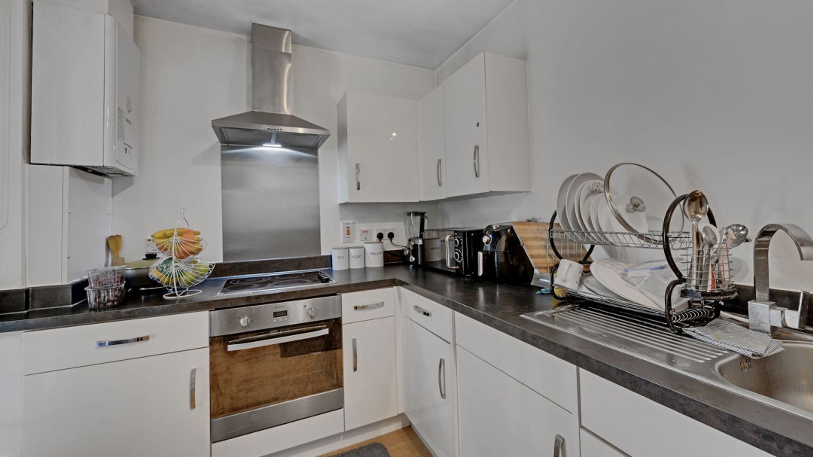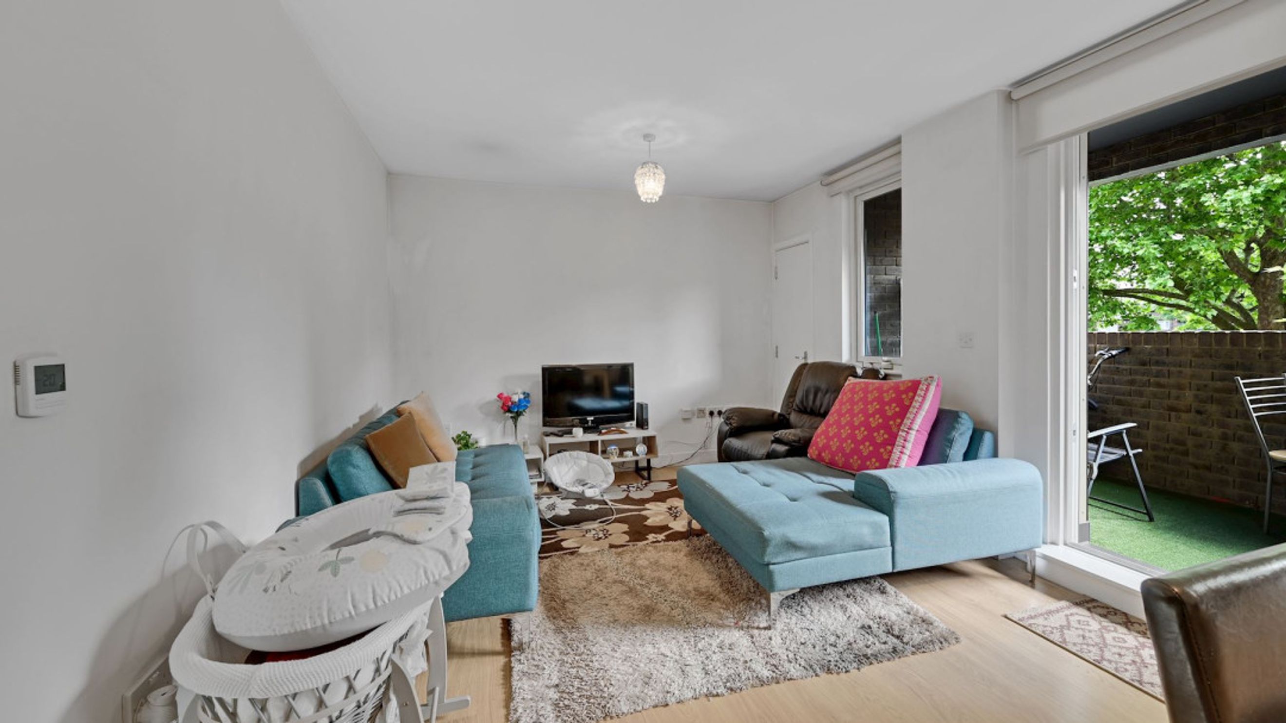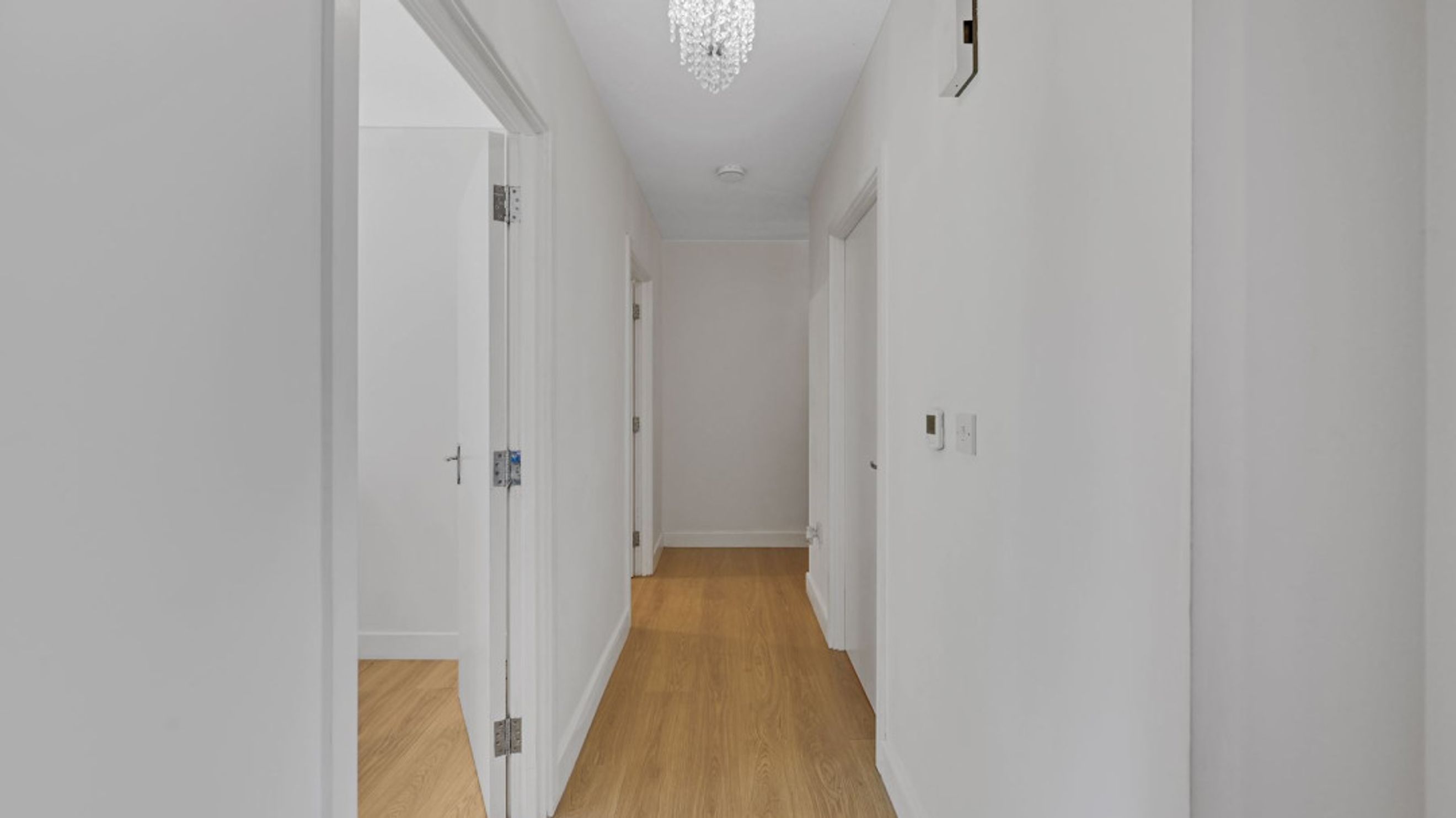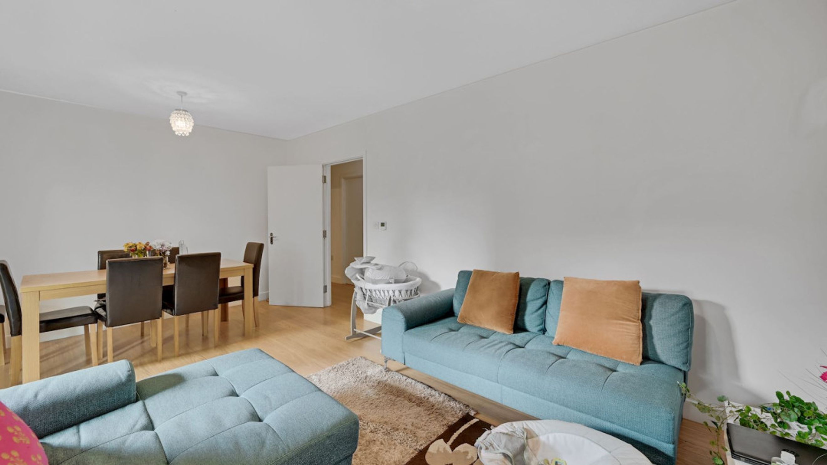 The property opens to a generous hallway that leads into a bright and airy reception room, featuring space for both lounge and dining and direct access to a private, covered balcony - perfect for relaxing or entertaining. A separate contemporary kitchen, finished with sleek white cabinetry and integrated appliances, offers plenty of workspace for those who enjoy cooking.