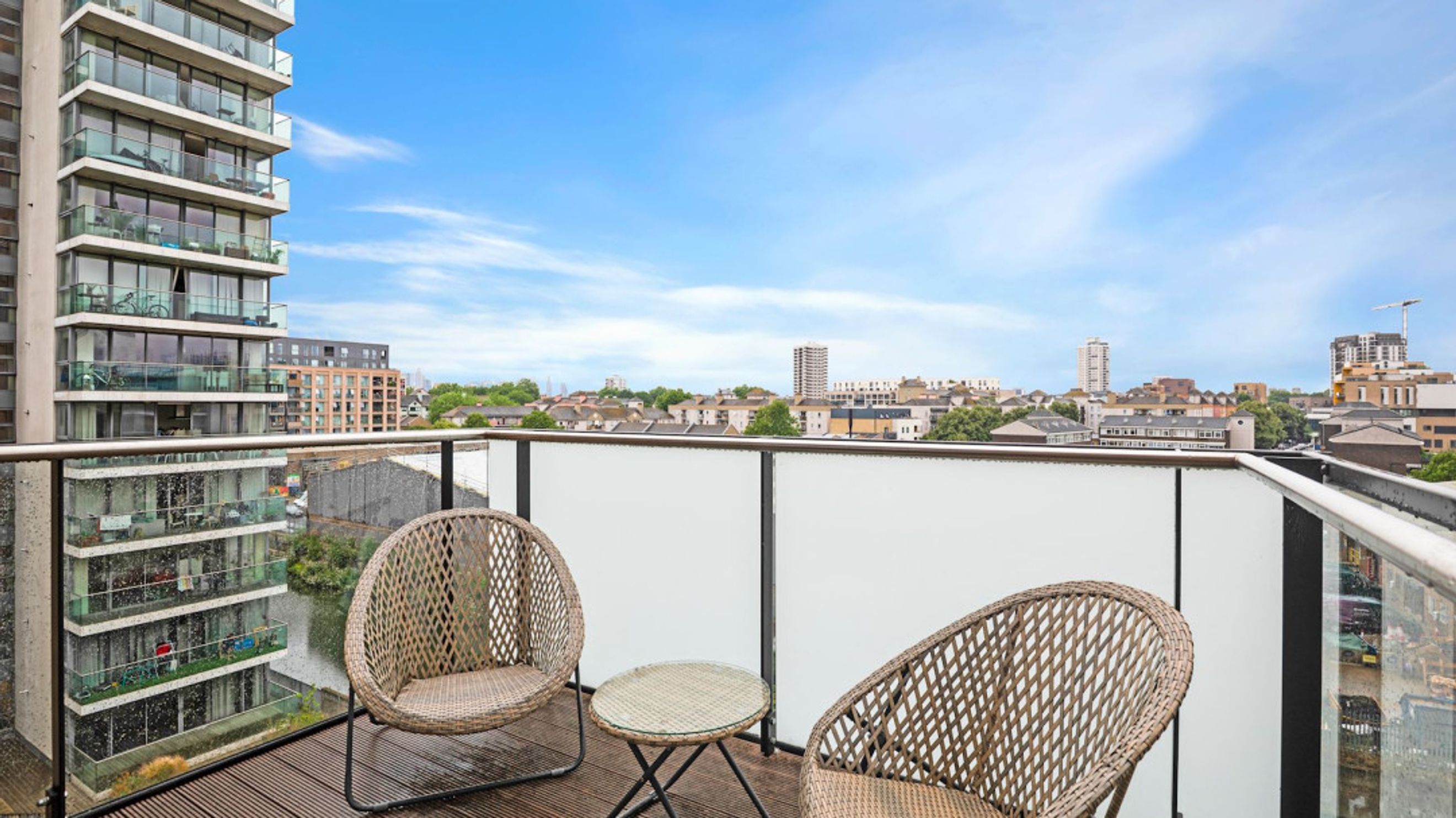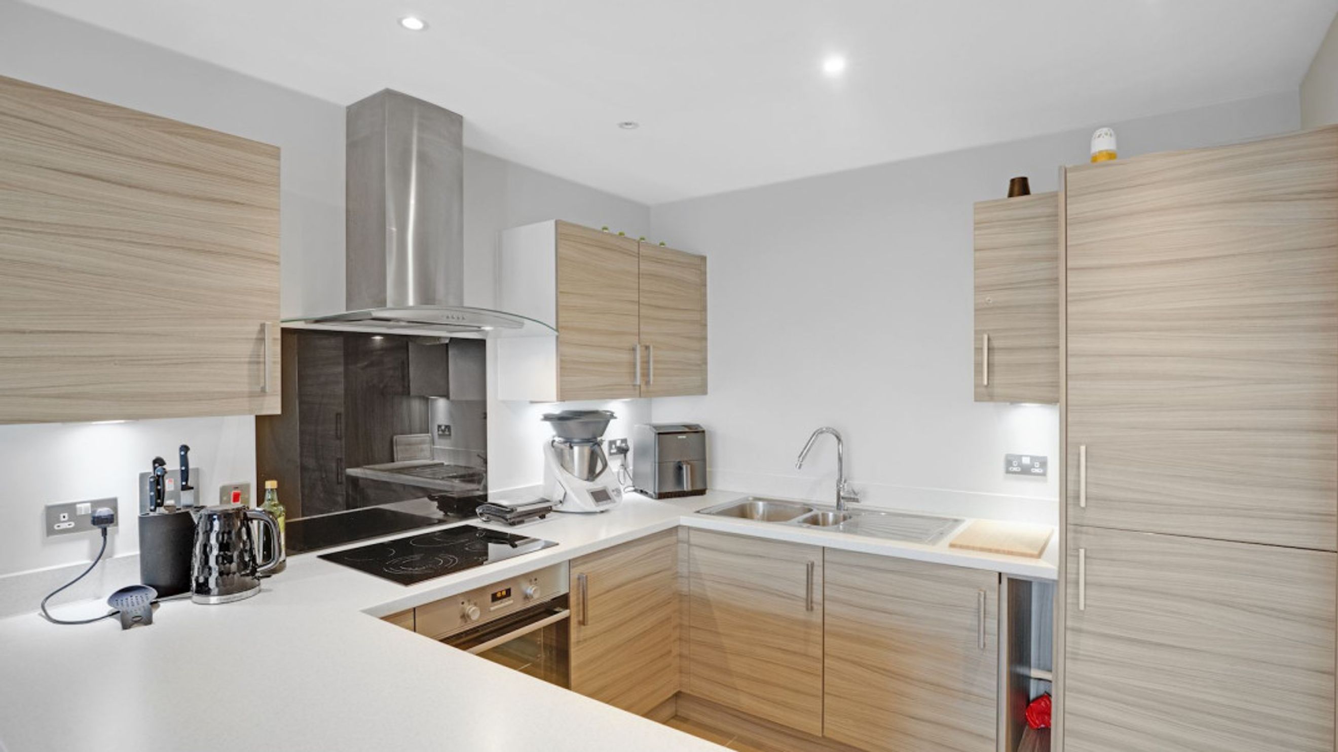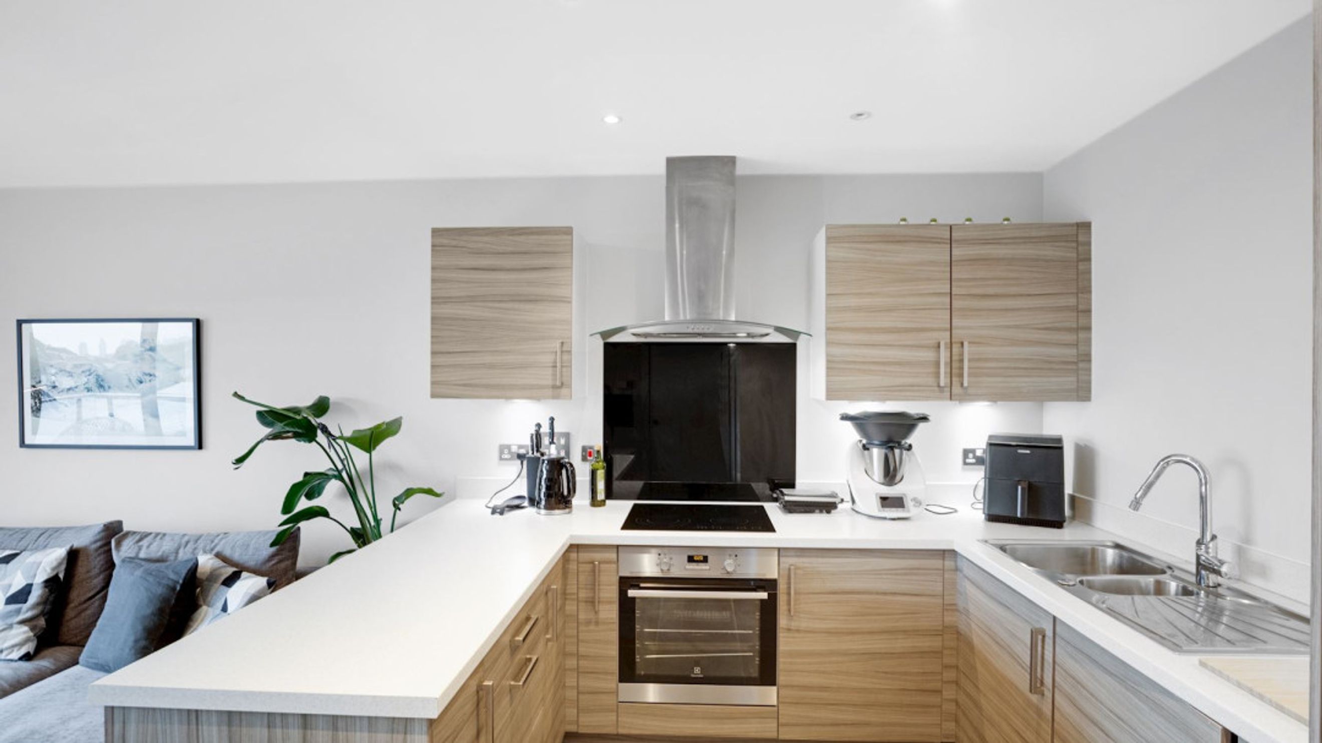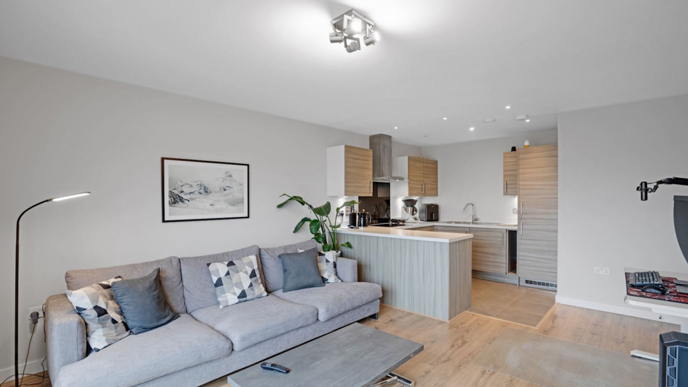 The home itself features a spacious open-plan kitchen and living area, flooded with natural light through full-height sliding doors that lead to a generously sized private balcony. The modern kitchen comes with integrated appliances and a sleek layout that blends seamlessly with the living space.