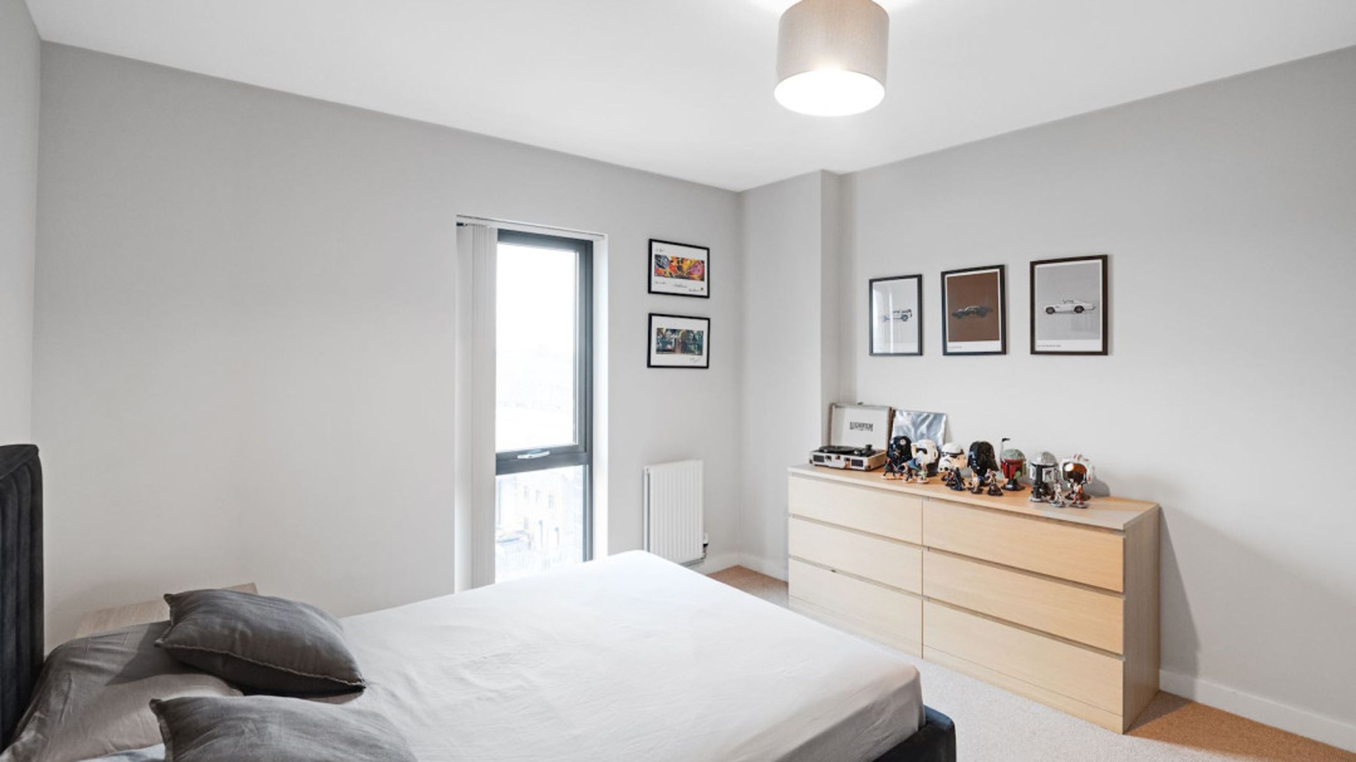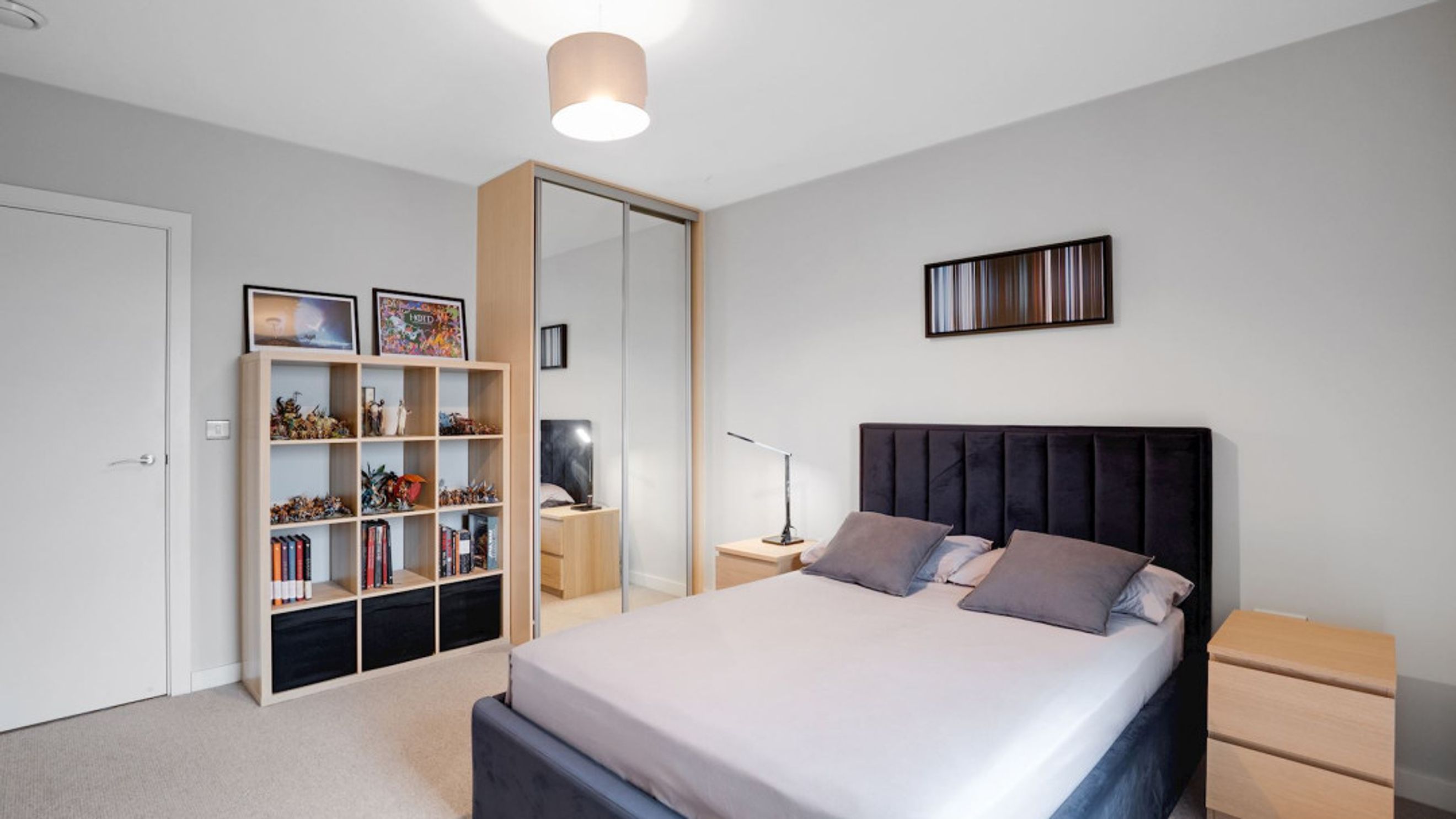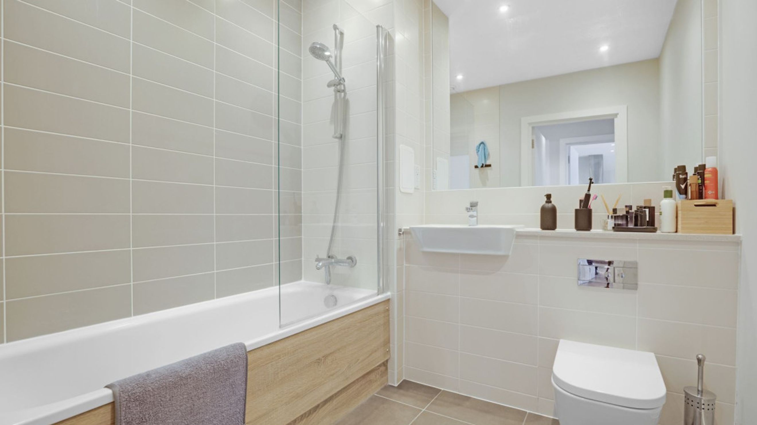 The bedroom is bright and spacious, offering a calm and cosy retreat. With natural tones and plush carpeting. The bathroom is well finished with clean tiling, a large mirror and a full sized bathtub.