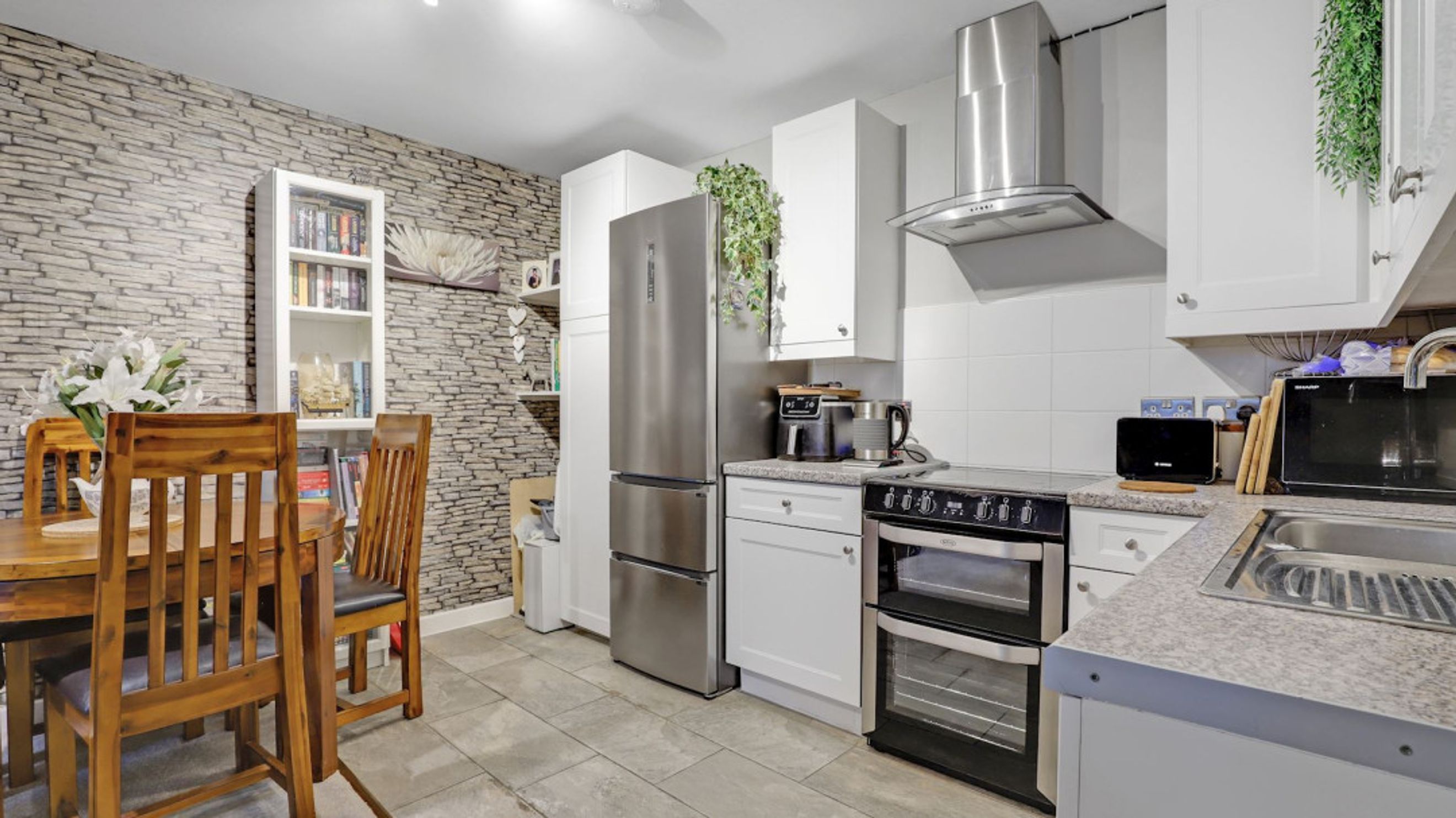 The property features a welcoming hallway leading to a bright, open-plan kitchen/reception area, perfect for relaxing or entertaining. The kitchen is fitted with contemporary white units, tiled flooring, while the living space benefits from a large window that floods the room with natural light and durable carpets.