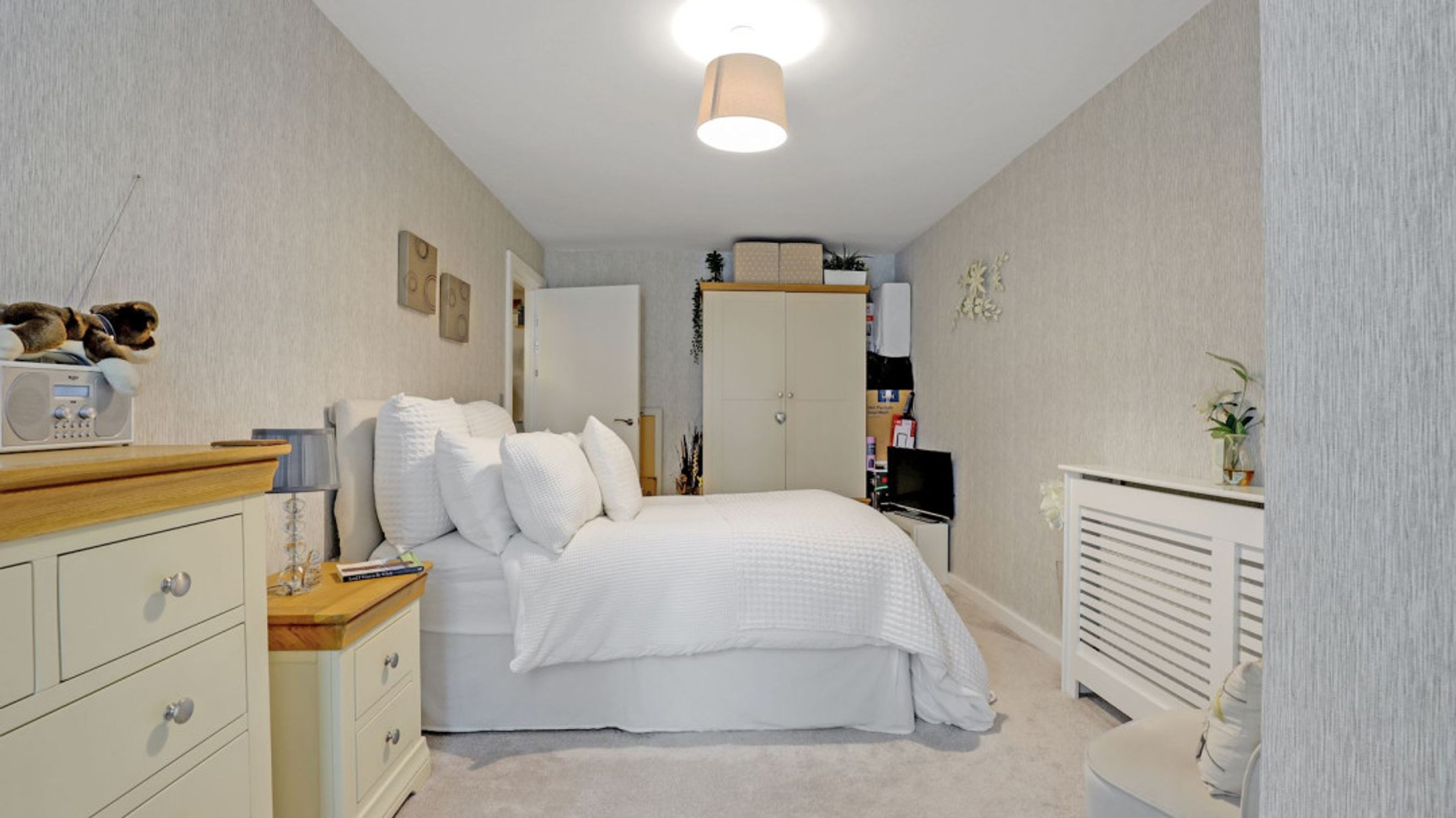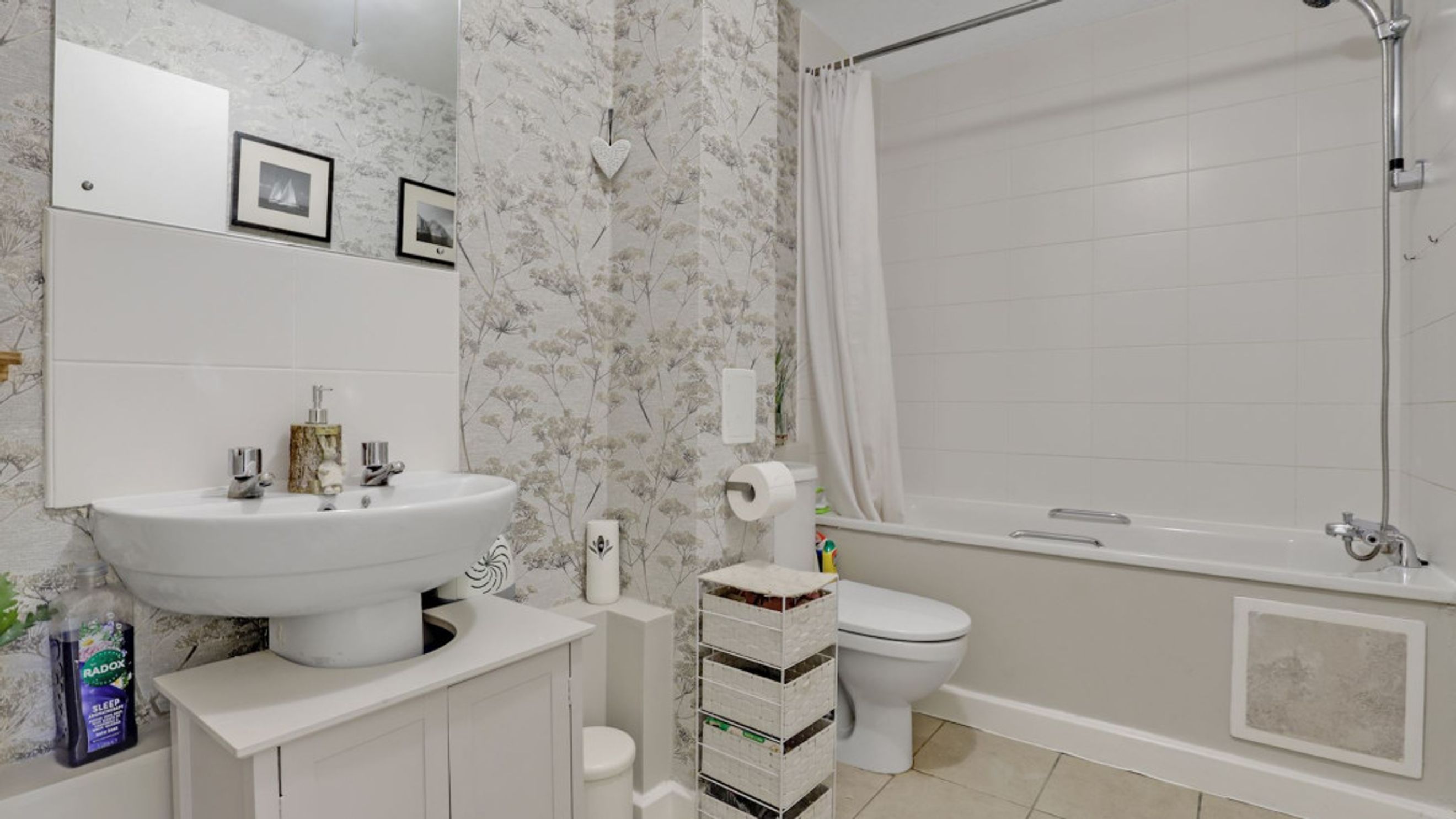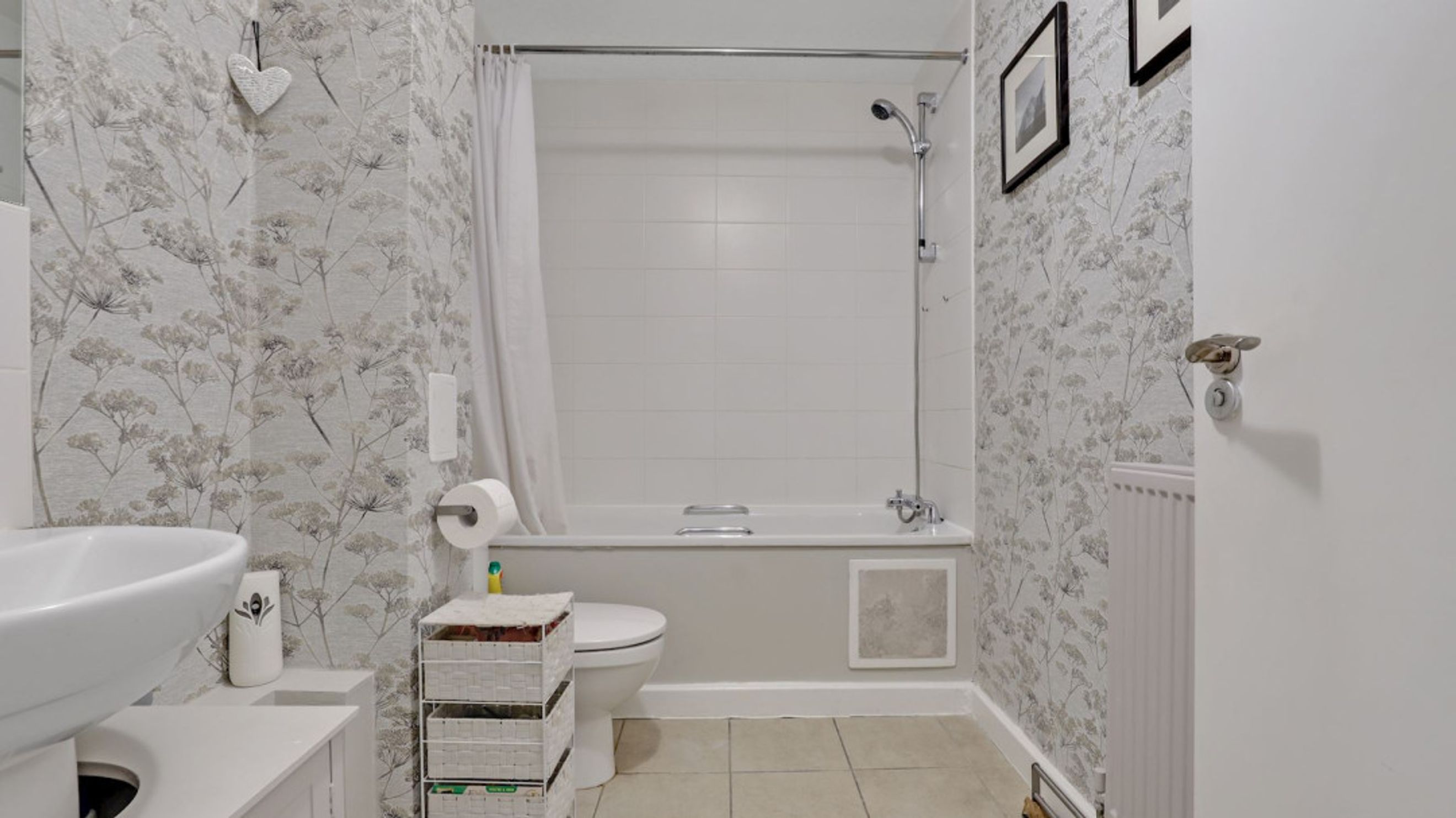 There are two good-sized bedrooms, including a spacious principal bedroom with ample storage, and a second double bedroom ideal for guests, a nursery, or a home office. The modern bathroom is fitted with a full-size bath, overhead shower, and vanity storage.