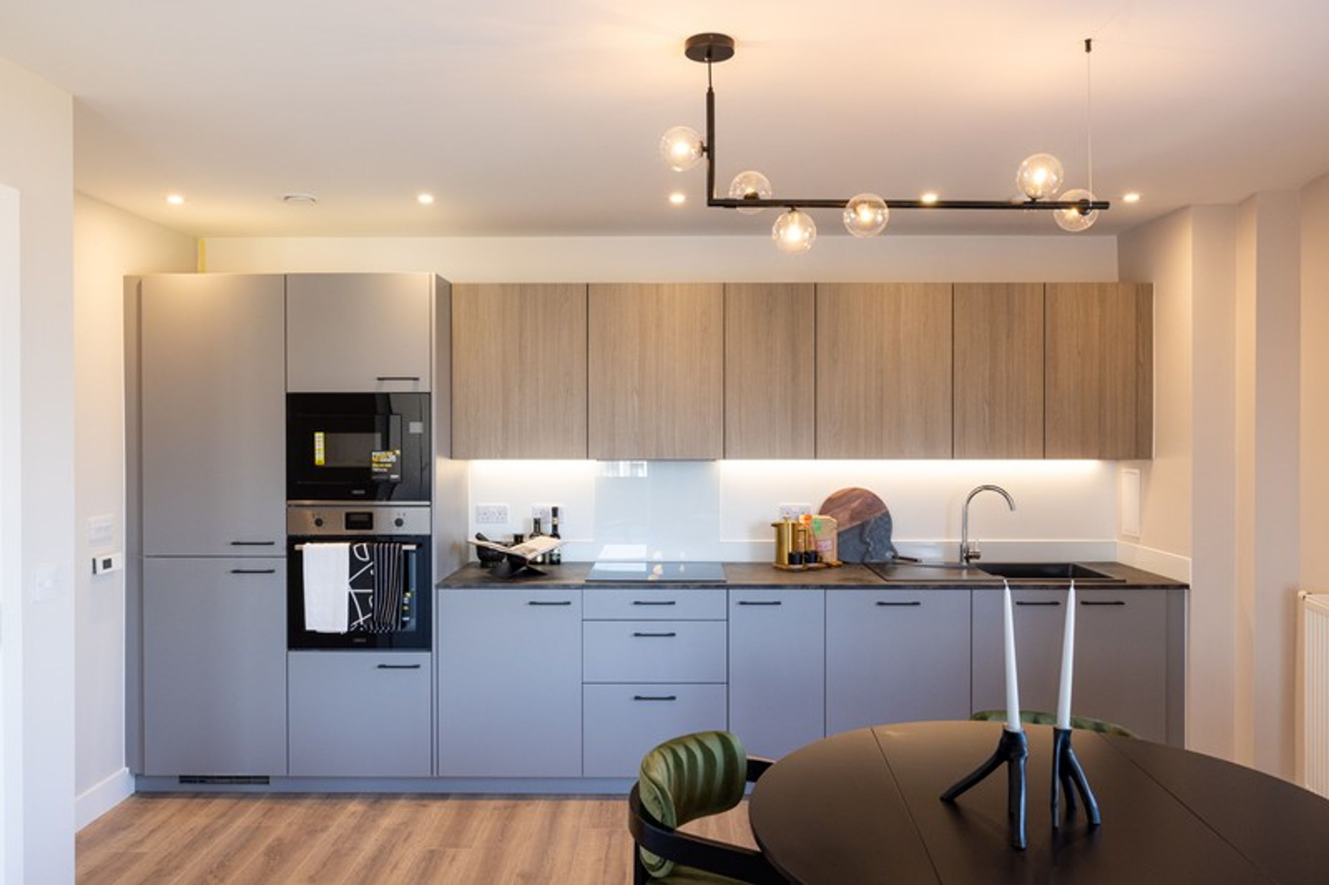 Situated on the 2nd floor, this 2-bedroom, 2-bathroom apartment offers a seamless blend of comfort and modern living. The open-plan living, dining, and kitchen area benefits from dual-aspect natural light, featuring sleek fittings and integrated appliances throughout. Enjoy direct access to a private balcony, perfect for outdoor relaxation. Ample storage is provided with a separate utility cupboard. The bathroom is finished with contemporary large-format tiles and a stylish vanity unit. Both spacious bedrooms offer plenty of room for wardrobe storage.