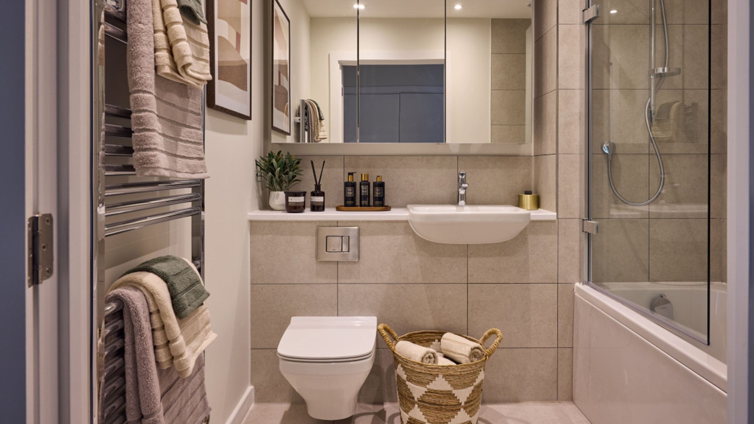 Plot 1.03 / Flat 29 is a stylish first-floor apartment measuring 107.26m². The property features a welcoming entrance hall with a convenient storage cupboard and washer, a modern L-shaped fitted kitchen with integrated appliances, and a bright open-plan living area leading onto a private balcony, accessible from both the lounge and bedroom. The spacious bedroom benefits from built-in wardrobes, while the contemporary bathroom is finished to a high standard with full tiling, a shower-over-bath, and a chrome heated towel rail.