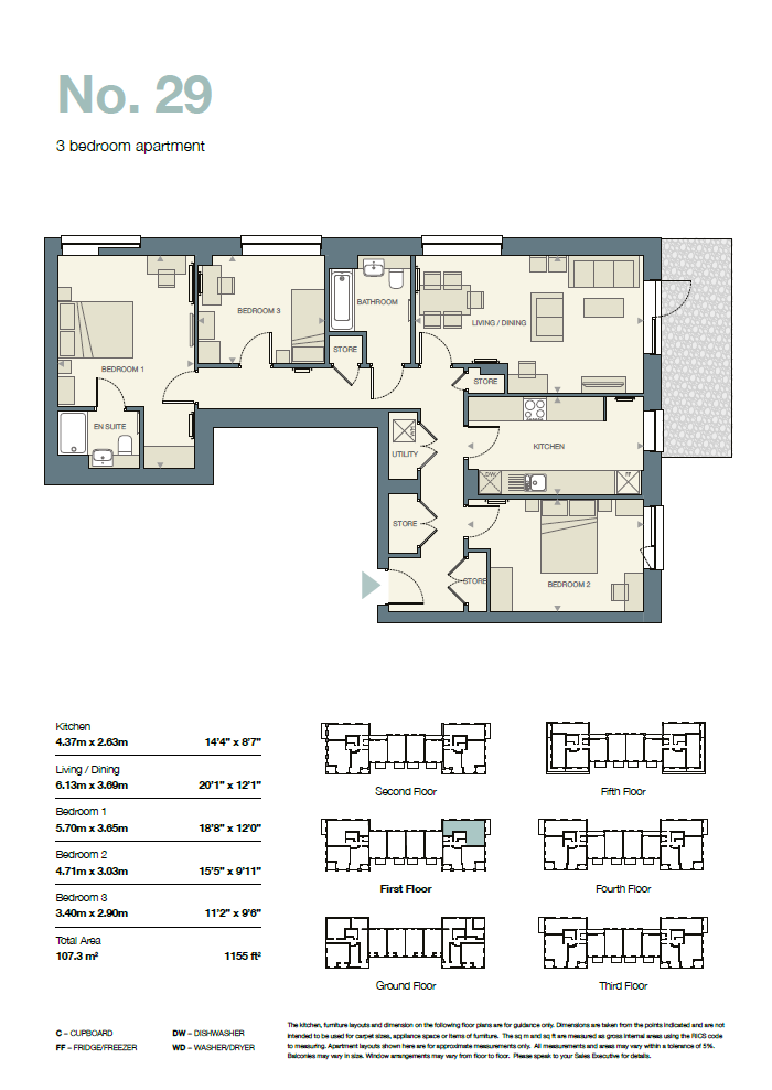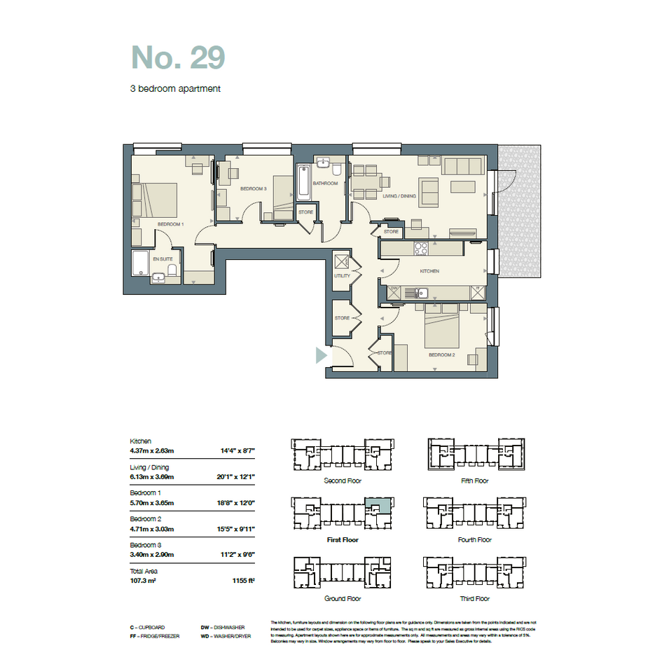 Plot 1.03 / Flat 29 is a stylish first-floor apartment measuring 107.26m². The property features a welcoming entrance hall with a convenient storage cupboard and washer, a modern L-shaped fitted kitchen with integrated appliances, and a bright open-plan living area leading onto a private balcony, accessible from both the lounge and bedroom. The spacious bedroom benefits from built-in wardrobes, while the contemporary bathroom is finished to a high standard with full tiling, a shower-over-bath, and a chrome heated towel rail.