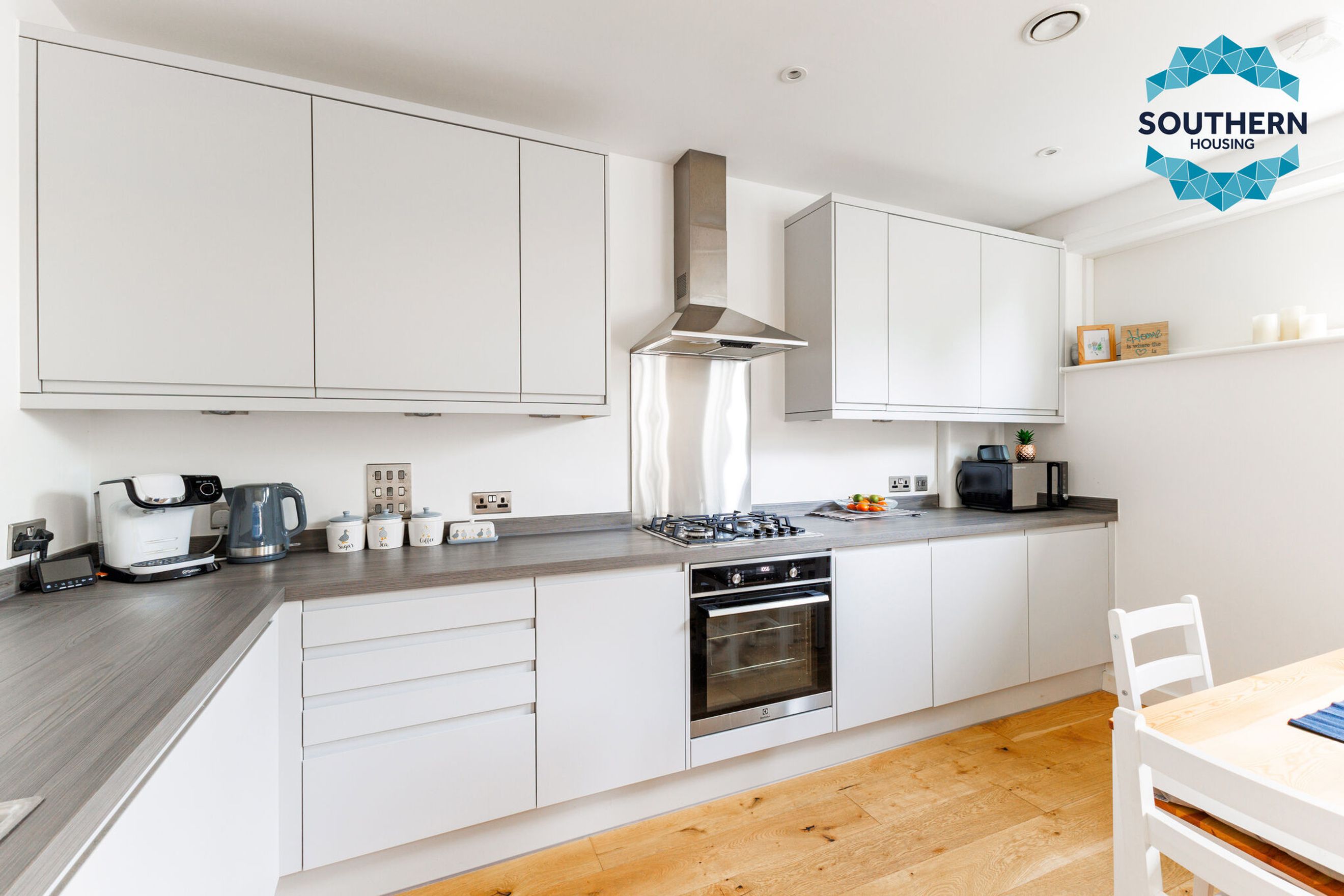 The kitchen is thoughtfully designed with a modern aesthetic, featuring excellent storage and countertop space. It comes fully equipped with integrated appliances including an oven, hob, extractor fan, and fridge/freezer, making it both stylish and practical.