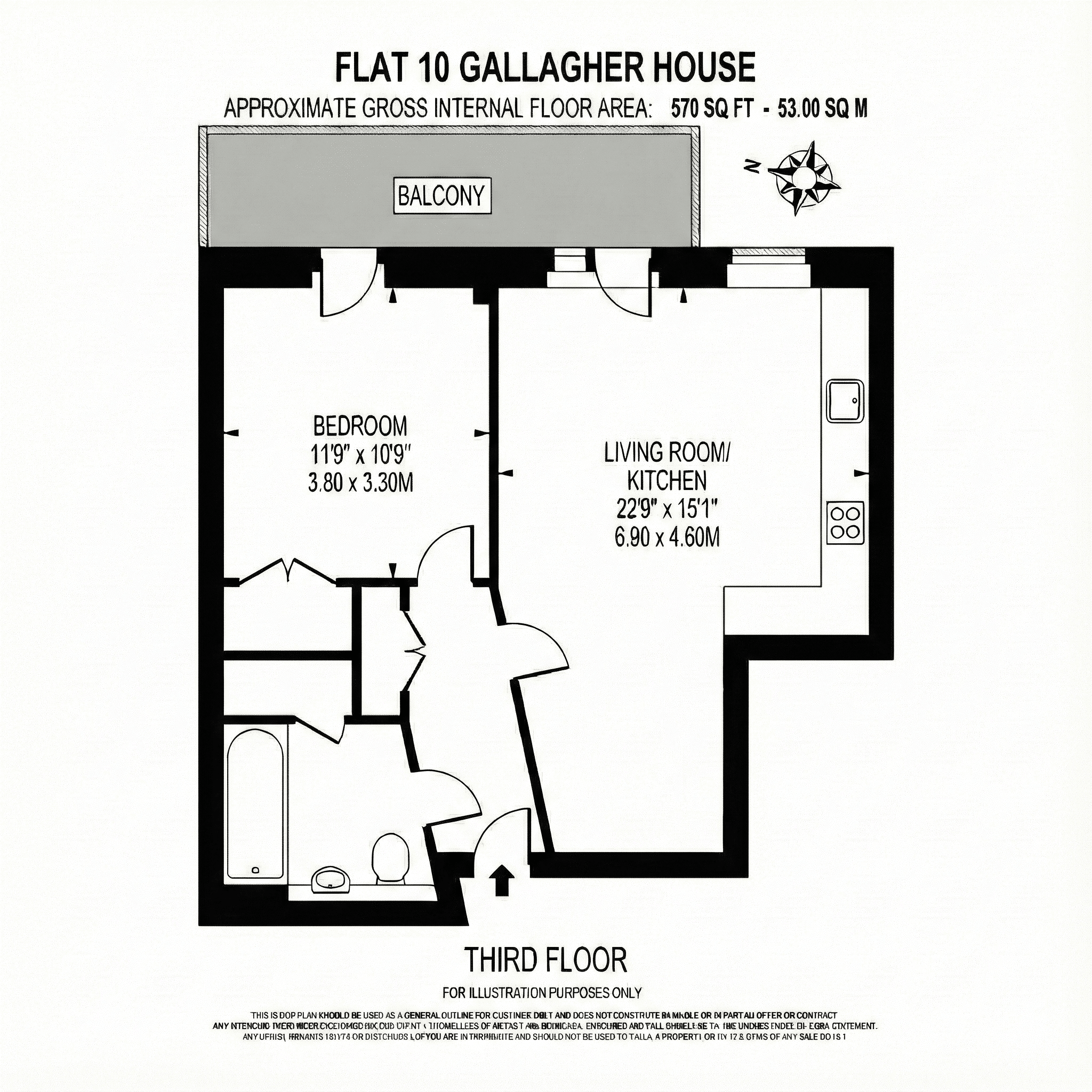 The separate bedroom is well-proportioned at 3.80 x 3.30m.