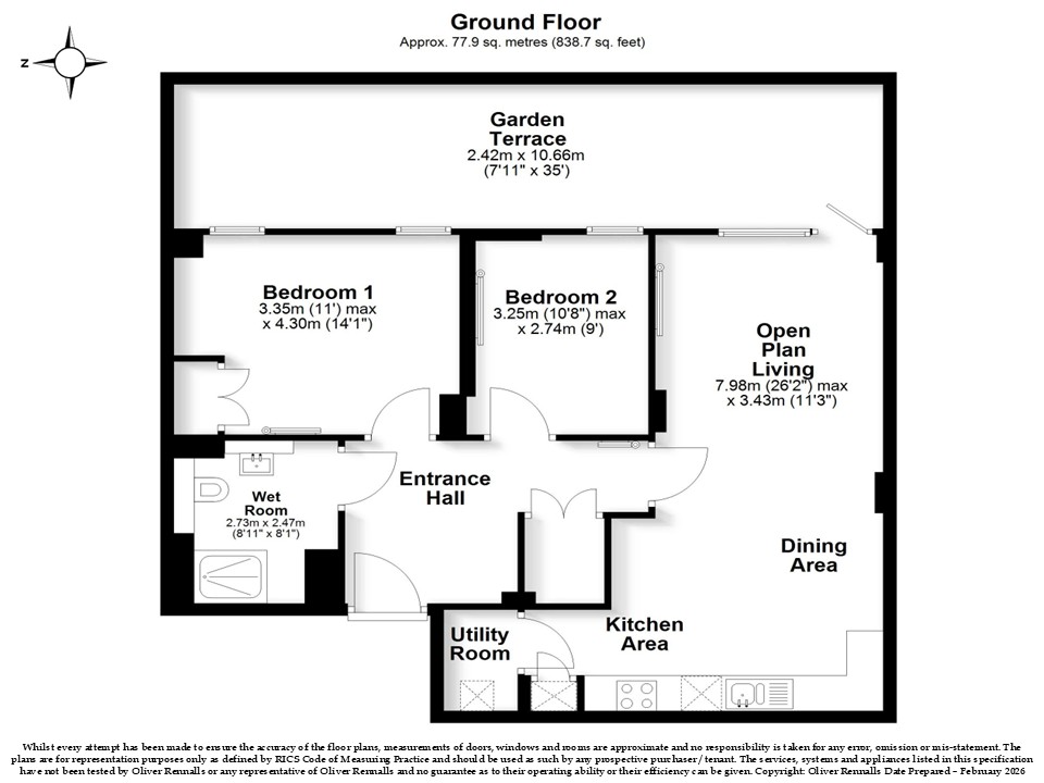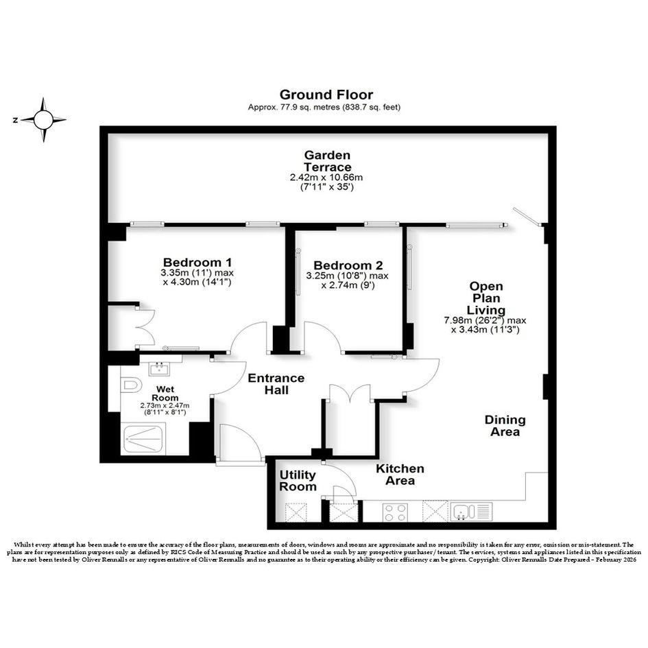 This home offers a bright open‑plan living area with floor‑to‑ceiling windows, a modern kitchen with integrated appliances, a fitted wardrobe in the main bedroom, and an accessible wet‑room bathroom. Enjoy your own private terrace, plus a communal garden and playground.